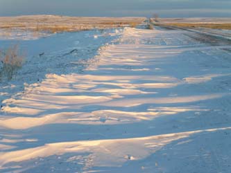 February 18, 2004 The blizzard is over and the sun has come out. I bundle up and head outside, camera in hand. I explore around the farm and then strike out into the pasture, always on alert. I am looking for interesting snowdrifts. I love snowdrifts—always have. When I was still at home, after every snowstorm I would go wading through snow sometimes way over my boots in search of interesting snowdrifts to photograph. Sometimes I went alone, sometimes with Mom, sometimes with all of my siblings in tow (with a sled to pull the youngest when she got too tired to walk through the snow). Sometimes I found photograph-worthy drifts, sometimes not, all depending on the wind, but it was always a lot of fun. Sure, we got cold and wet and very, very tired from tramping through deep snow, but it never seemed to bother us. If there weren’t interesting snowdrifts, we still went sledding, so it was never a wasted effort. Our pastures were flat, but there was one long rolling hill that gave a decent ride if somebody gave the sled a hard enough push. And there was the lake. It had extremely steep banks, and during the summer we gave it a wide berth for fear they would crumble beneath our feet. But in winter, heavy snow and wind turned them into snow cliffs. We may not have had good sledding hills, but we had snow cliffs. And taking a sled down those almost-vertical slopes onto an icy, snow-covered lake was one wild ride! It was not for the faint of heart. I loved it then. I don’t think I’d dare do it now. When I left home, I moved to a state that didn’t have nearly as much wind, so I never saw “real” snowdrifts. And when I moved back to North Dakota, it was in a dry stretch, and most winters didn’t produce much snow. And when we did get a lot of snow, it wasn’t windy, so I just had a heavy blanket to shovel, no drifts to admire. This winter we’ve had both wind and a considerable amount of snow, and I am sure there are some fantastic drifts out there, but it’s been too bitterly cold to go tramping through the pastures to find them. The modest drifts around my yard haven’t been photograph-worthy, but I still kept pausing to admire them as I shoveled my driveway. And not long ago when I was out driving I pulled over to take pictures of snowdrifts. They were only finger drifts across a gravel road, but the lighting was perfect and the play of light and shadow was fascinating. And I fell in love with snowdrifts all over again.