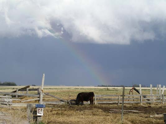 A rainbow of hope softly shines through the golden-tinged atmosphere of a just-past storm. Instead of desperately-needed rain, the storm brought hail. But farmers live on rainbows of hope. Maybe the next cloud will bring a nice, steady, drenching rain to jumpstart all the fields. Meanwhile, everybody is enjoying the freshened air, the steer taking a leisurely drink, and the calves bouncing around just out of range of the camera viewfinder. In North Dakota, we take our joy where we can find it. |