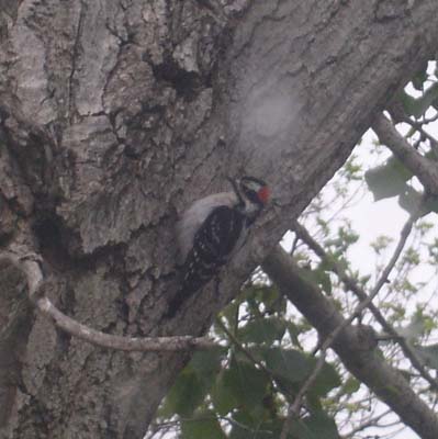 This woodpecker (or one of his many friends) spends hours entertaining the cats and me as he drums away at the tree outside my window. He was so intent on his business that I snuck outside and took several pictures before he noticed and hopped around the tree out of sight, but they weren’t at the best angle. When I came back in the house, he was already hard at work again, and I took this picture through the window. (The light spot is actually a raindrop on the window.) Funny how such a little thing can brighten up a drab, dreary day! |